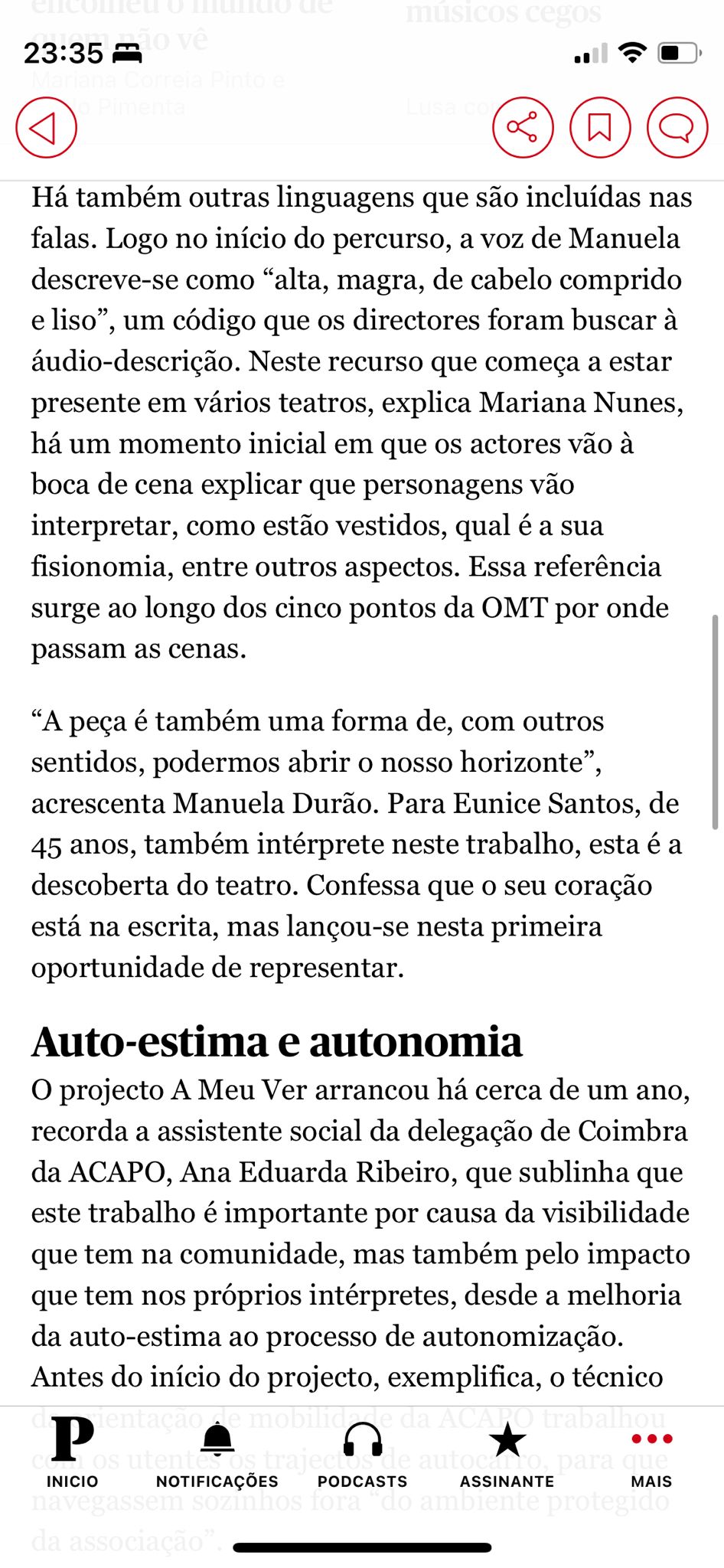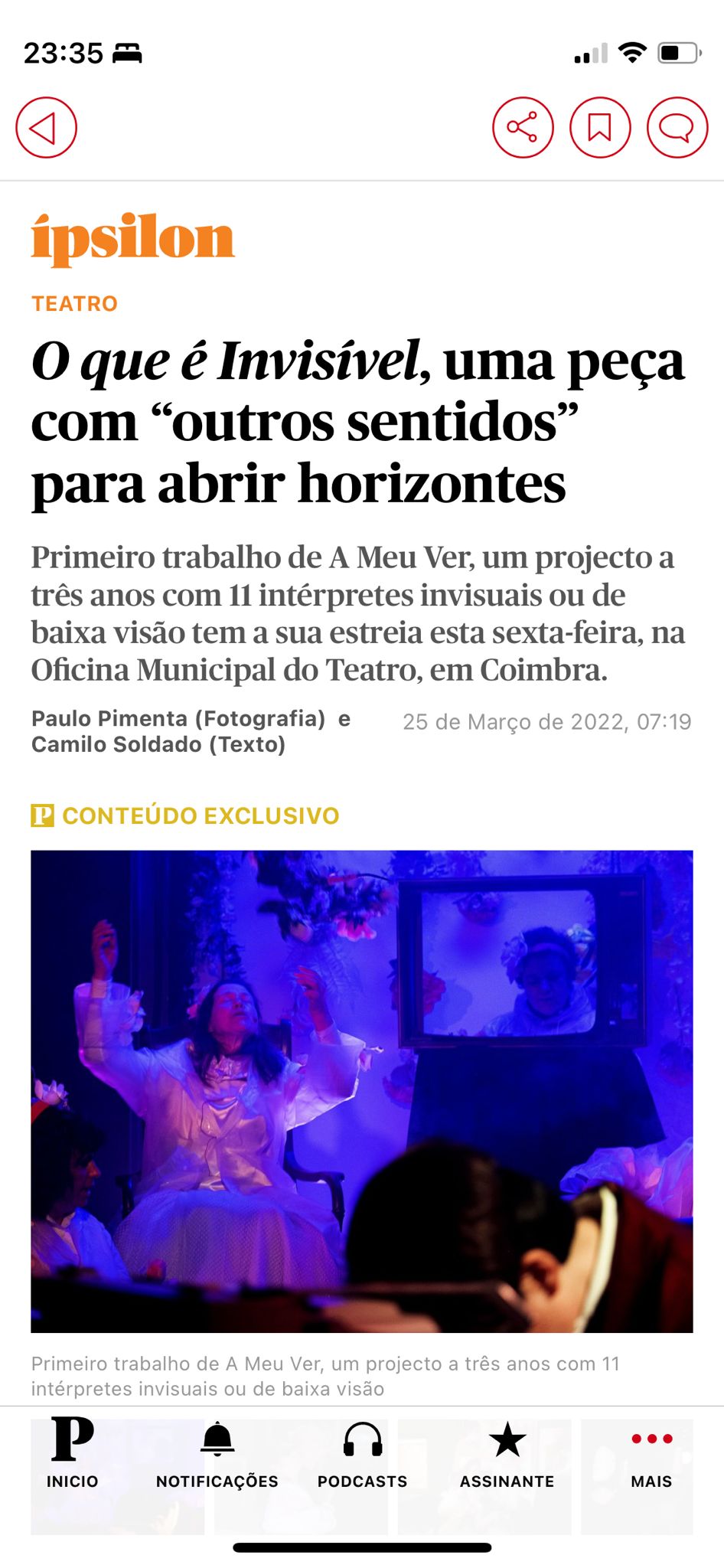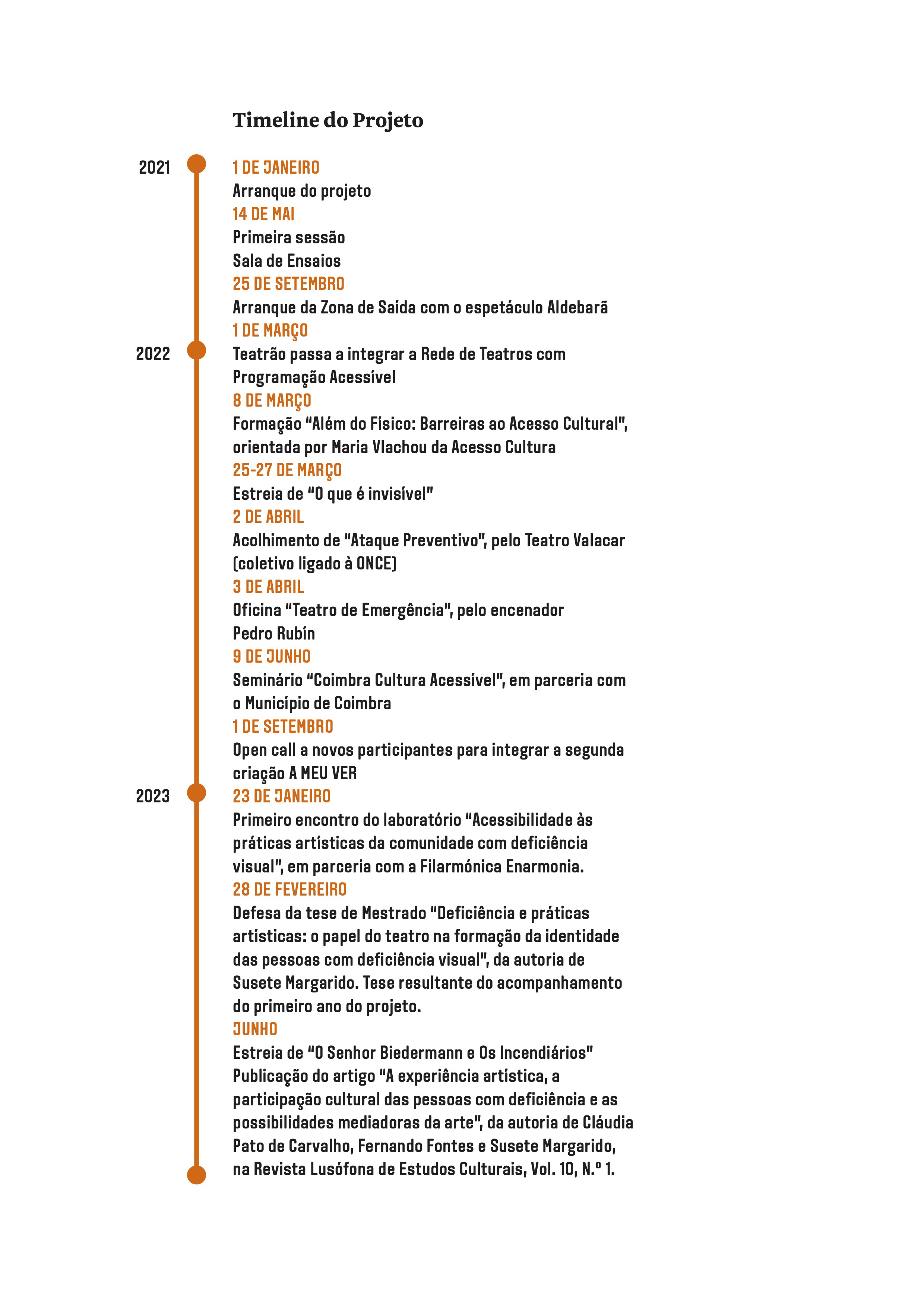 A prática teatral com pessoas com deficiência visual é praticamente inexistente em Portugal. A produção de conhecimento a partir desta experiência, o estudo e acompanhamento de outras práticas internacionais e o contacto com cientistas sociais já com reflexão nesta área é fundamental. Daí que tenha nascido uma parceria internacional com coletivos teatrais associados à ONCE, nomeadamente os núcleos da Corunha, Sevilha e Madrid, que desde a década de oitenta do século passado têm desenvolvido uma prática continuada de produção e digressão de espetáculos com resultados muito expressivos para intérpretes e comunidades. Também por isso, convidámos os investigadores Fernando Fontes e Cláudia Pato de Carvalho do CES-UC para acompanhar, monitorizar e medir os impactos deste projeto na vida dos seus participantes. Acessibilidade Cultural A MEU VER é também uma intervenção sobre a cidade de Coimbra, nomeadamente no que à acessibilidade cultural diz respeito. A OMT é o único espaço da cidade que faz parte da Rede de Teatros com Programação Acessível, integrando, na sua programação regular, tradução em Língua Gestual Portuguesa e, a partir de 2022, serviço de Audiodescrição. Esta oferta integra espetáculos da companhia ou acolhimentos externos nas áreas do teatro e da dança. Nesse mesmo ano, programámos a formação “Além do Físico: barreiras à participação cultural”, da Acesso Cultura, dirigida a agentes, programadores, diretores, gestores, mediadores e produtores culturais da cidade e região. Por outro lado, em parceria com o Município de Coimbra, programámos o seminário “Coimbra Cultura Acessível”, onde procurámos iniciar uma discussão sobre as políticas de acessibilidade a espaços culturais na cidade para desenhar a transição a operar para uma cidade culturalmente mais acessível. O impacto destas atividades e a visibilidade destas práticas para a restante comunidade é uma outra dimensão fundamental de A MEU VER. Neste sentido tornou-se ainda mais importante a produção de materiais, como artigos científicos, que inscrevem este projeto no tempo e contribuem para a sustentabilidade futura do mesmo.