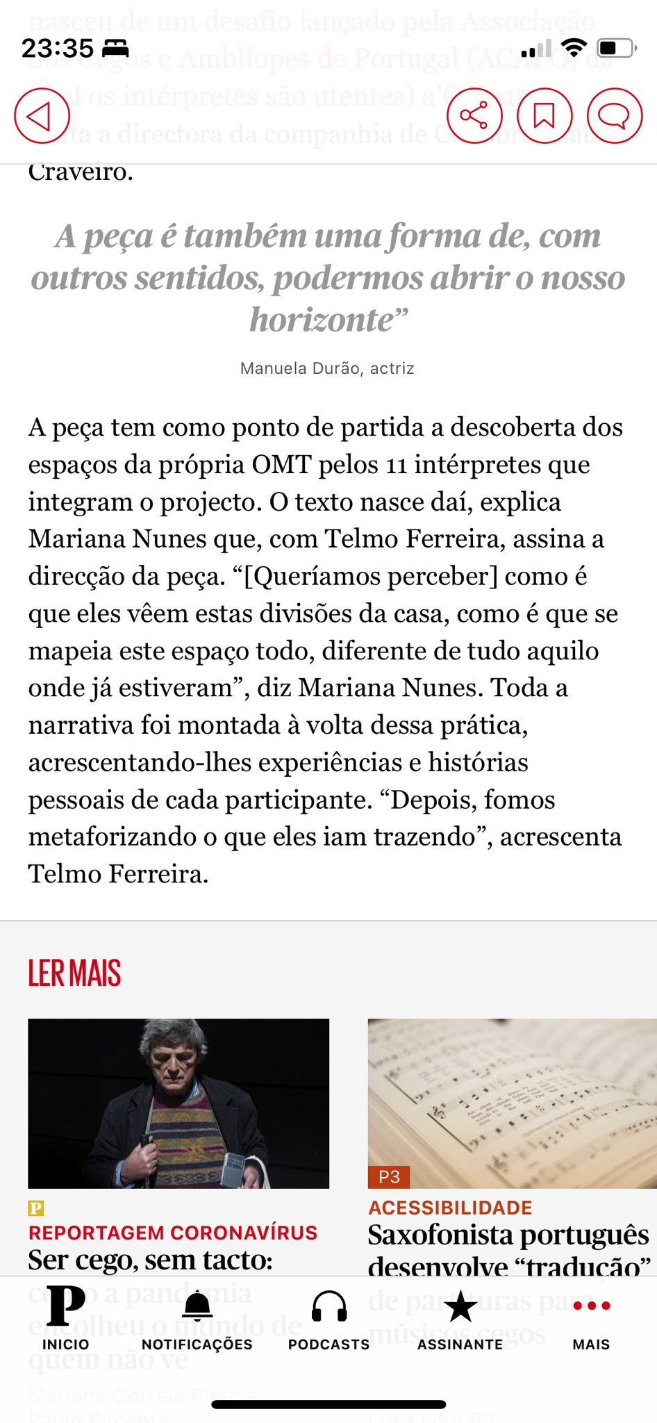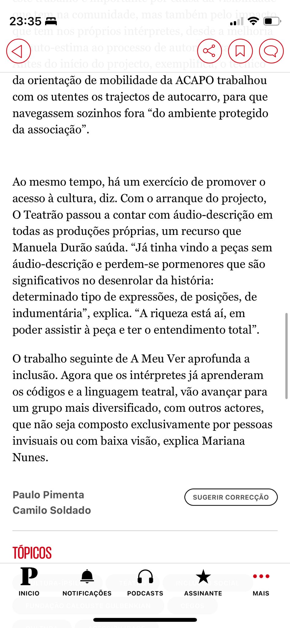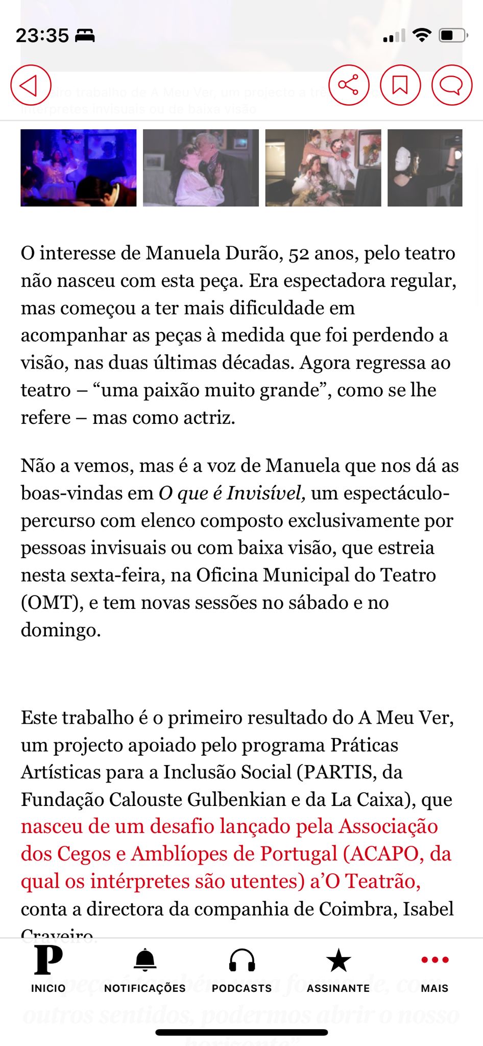 A prática teatral com pessoas com deficiência visual é praticamente inexistente em Portugal. A produção de conhecimento a partir desta experiência, o estudo e acompanhamento de outras práticas internacionais e o contacto com cientistas sociais já com reflexão nesta área é fundamental. Daí que tenha nascido uma parceria internacional com coletivos teatrais associados à ONCE, nomeadamente os núcleos da Corunha, Sevilha e Madrid, que desde a década de oitenta do século passado têm desenvolvido uma prática continuada de produção e digressão de espetáculos com resultados muito expressivos para intérpretes e comunidades. Também por isso, convidámos os investigadores Fernando Fontes e Cláudia Pato de Carvalho do CES-UC para acompanhar, monitorizar e medir os impactos deste projeto na vida dos seus participantes. Acessibilidade Cultural A MEU VER é também uma intervenção sobre a cidade de Coimbra, nomeadamente no que à acessibilidade cultural diz respeito. A OMT é o único espaço da cidade que faz parte da Rede de Teatros com Programação Acessível, integrando, na sua programação regular, tradução em Língua Gestual Portuguesa e, a partir de 2022, serviço de Audiodescrição. Esta oferta integra espetáculos da companhia ou acolhimentos externos nas áreas do teatro e da dança. Nesse mesmo ano, programámos a formação “Além do Físico: barreiras à participação cultural”, da Acesso Cultura, dirigida a agentes, programadores, diretores, gestores, mediadores e produtores culturais da cidade e região. Por outro lado, em parceria com o Município de Coimbra, programámos o seminário “Coimbra Cultura Acessível”, onde procurámos iniciar uma discussão sobre as políticas de acessibilidade a espaços culturais na cidade para desenhar a transição a operar para uma cidade culturalmente mais acessível. O impacto destas atividades e a visibilidade destas práticas para a restante comunidade é uma outra dimensão fundamental de A MEU VER. Neste sentido tornou-se ainda mais importante a produção de materiais, como artigos científicos, que inscrevem este projeto no tempo e contribuem para a sustentabilidade futura do mesmo.