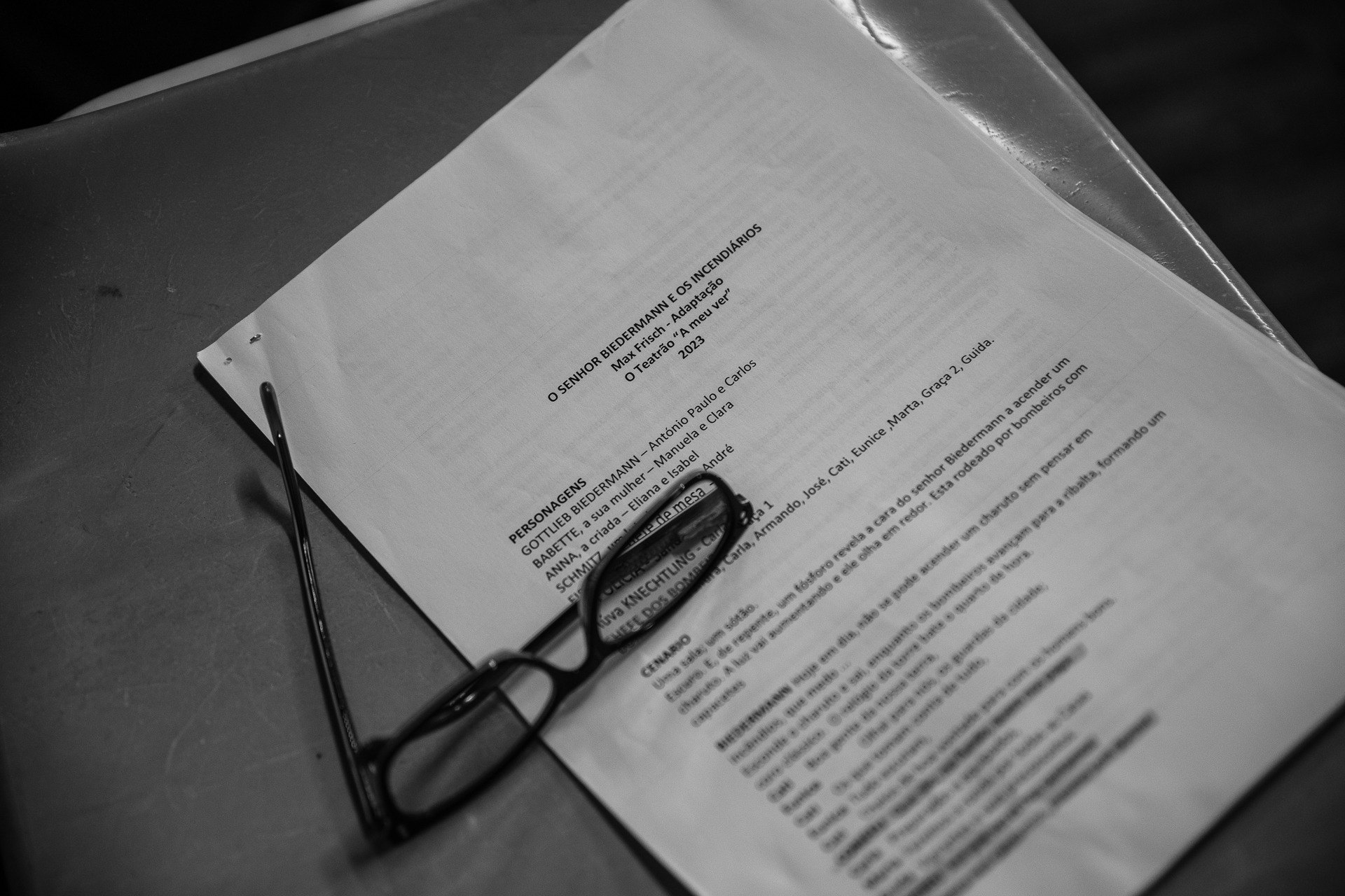 Depois d’O que é invisível Um ano e poucos meses depois de desvendar “O que é invisível”, o primeiro espetáculo criado pelo projeto “A Meu Ver”, agora propomo-nos a revelar o que está à vista de todos. Se no ano passado nos voltamos para as pequenas coisas, aquelas que são tão pequenas que apenas cabem nos sonhos, agora procuramos ver aquilo que, de tão grande que é, apenas é visível quando unimos os nossos olhares numa direção. Este caminho foi trilhado ao atravessar as sintonias que todos os processos artísticos exigem. Assim, descobrimos a necessidade de juntar, às várias vozes que falavam de si, um coro que revelava um “Nós”. Se antes buscámos a singularidade de cada um dentro de um grupo que poderia ser rotulado por uma circunstância comum, a abertura desse mesmo grupo a todas as pessoas da comunidade ao redor fez-nos procurar espaços partilhados e perspetivas que só se revelam quando nos unimos. Este processo fez-nos perceber que a maioria dos problemas, quando devidamente vistos, dizem respeito a todos, e não somente àqueles que se encontram mais próximos. Desse entendimento, nasceu uma imagem: como um fogo que alastra descontroladamente, a falta de um sentido coletivo torna-nos insensíveis às chamas que ameaçam casas distantes, sem compreender que, se nada for feito, mais cedo ou mais tarde, a nossa própria casa será levada pelas chamas. Inspirados por essa imagem, recorrendo ao texto de Max Frisch, “Biedermann e os Incendiários”, propomos agora ver algo ainda mais desafiante do que o invisível. Propomo-nos a ver aquilo que, por excesso de confiança ou privilégio, recusamos ver nas suas verdadeiras dimensões. Com este espetáculo, sugerimos que todos possam ver como um problems nosso aquilo que consideramos ser de apenas alguns, assim: Talvez o fogo não seja tão avassalador para aqueles que o enfrentam de perto, se as chamas não parecerem tão pequenas para aqueles que o observam de longe. Mariana Nunes e Telmo Ferreira
