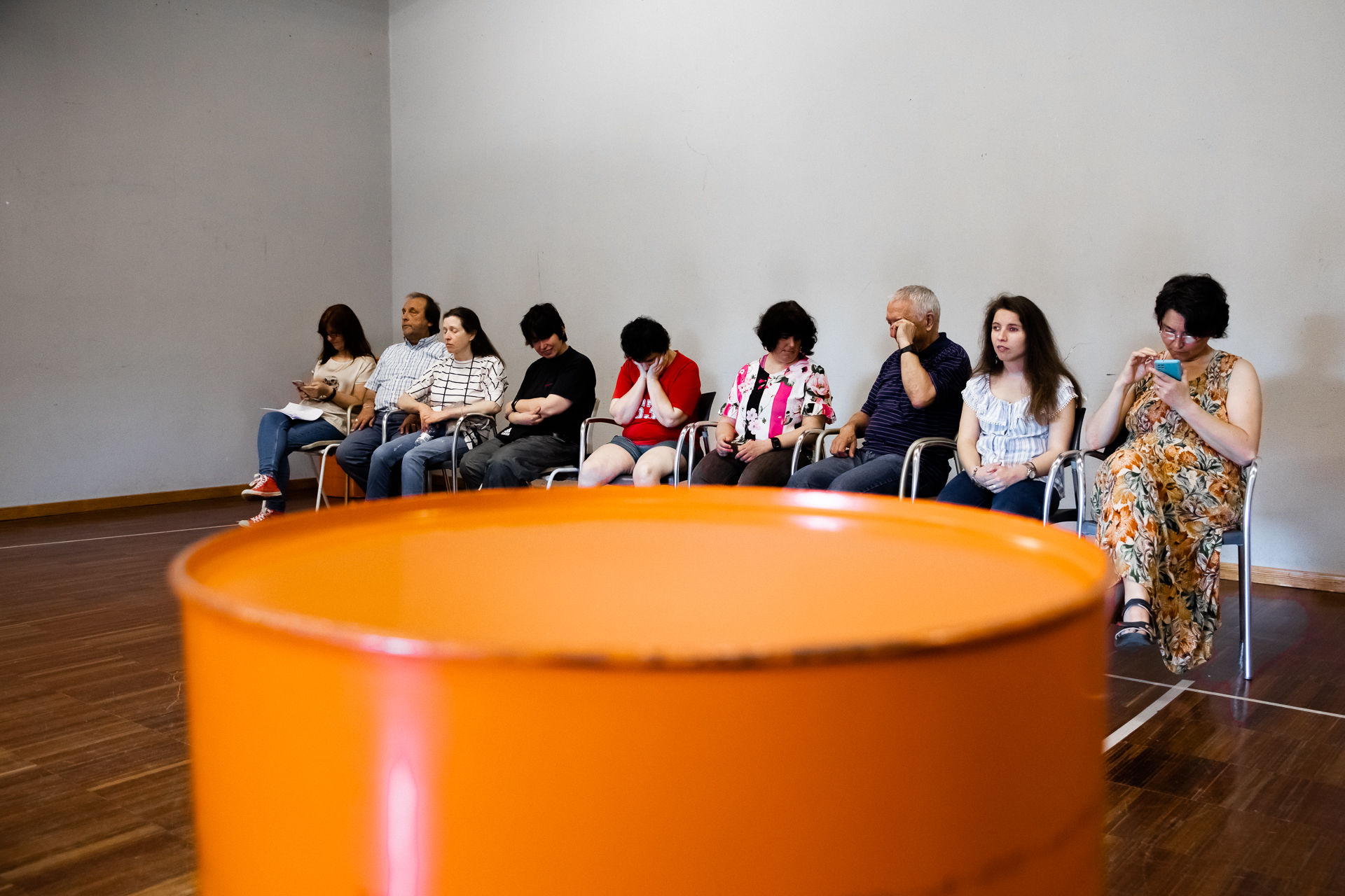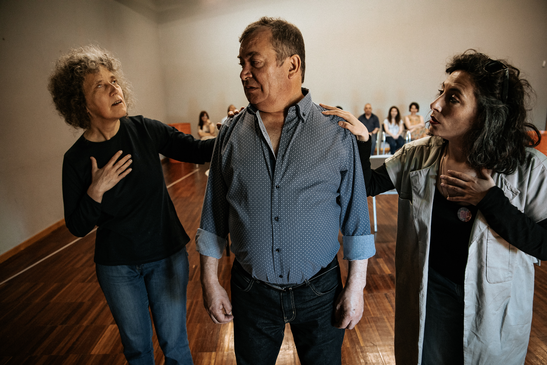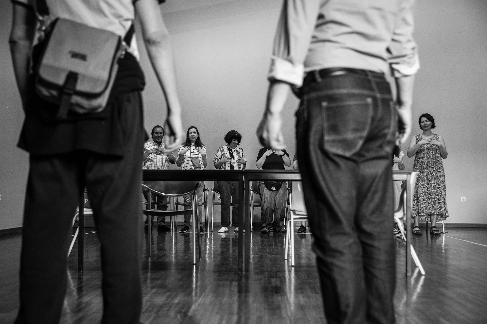 Inicialmente, o grupo foi composto por indivíduos com graus diversos de deficiência visual. Mais de metade vive em isolamento social, dependente, e sem participação cívica. Uma parte dos utentes teve acesso à formação profissional e trabalha, embora o seu rendimento não permita a independência financeira. No que toca à atividade cultural, raramente consomem bens culturais, tendendo a circunscrever esta atividade ao seu domicílio, à televisão ou rádio. A sua participação no projeto tem concretizado a sua integração do núcleo teatral, no processo de ensaios e de produção das criações e em ensaios abertos. Entretanto, a partir de uma open call de setembro de 2022, o grupo de teatro passou a integrar também participantes normovisuais, perfazendo um grupo de 18 pessoas.